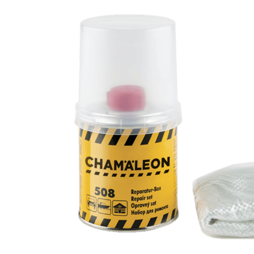 The set includes unsaturated, elasticized polyester resin, hardener as well as glassfibre fabric