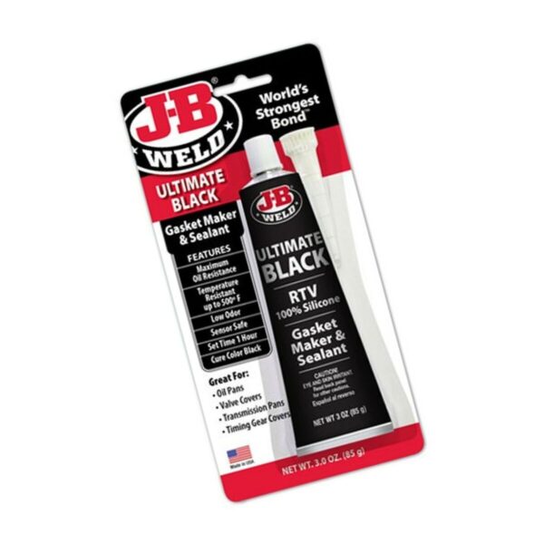 J-B Weld Ultimate Black Gasket Maker andamp; Sealant is an RTV (Room Temperature Vulcanized) Silicone gasketing material designed for use in mechanical assemblies where maximum petroleum and oil resistance is required. Upon curing, which occurs when the product is exposed to the moisture in air, the silicone forms a tough, waterproof, gasket and seal on most surfaces. It will not shrink or crack, resists oil and petroleum products, resists weathering, is sensor safe, has good temperature resistance up to 260?C intermittent and is great for many automotive applications.