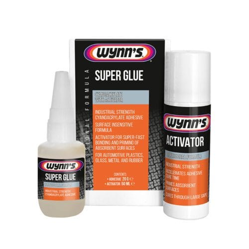 Wynn’s Industrial Strength Super Glue can be used with or without the activator. Use activator when a super-fast bond is required or when bonding porous surfaces. Apply activator to opposite side from adhesive and assemble, or spray activator onto joint after assembly. To reinforce initial bond or when filleting joints apply further adhesive and then spray activator onto adhesive.